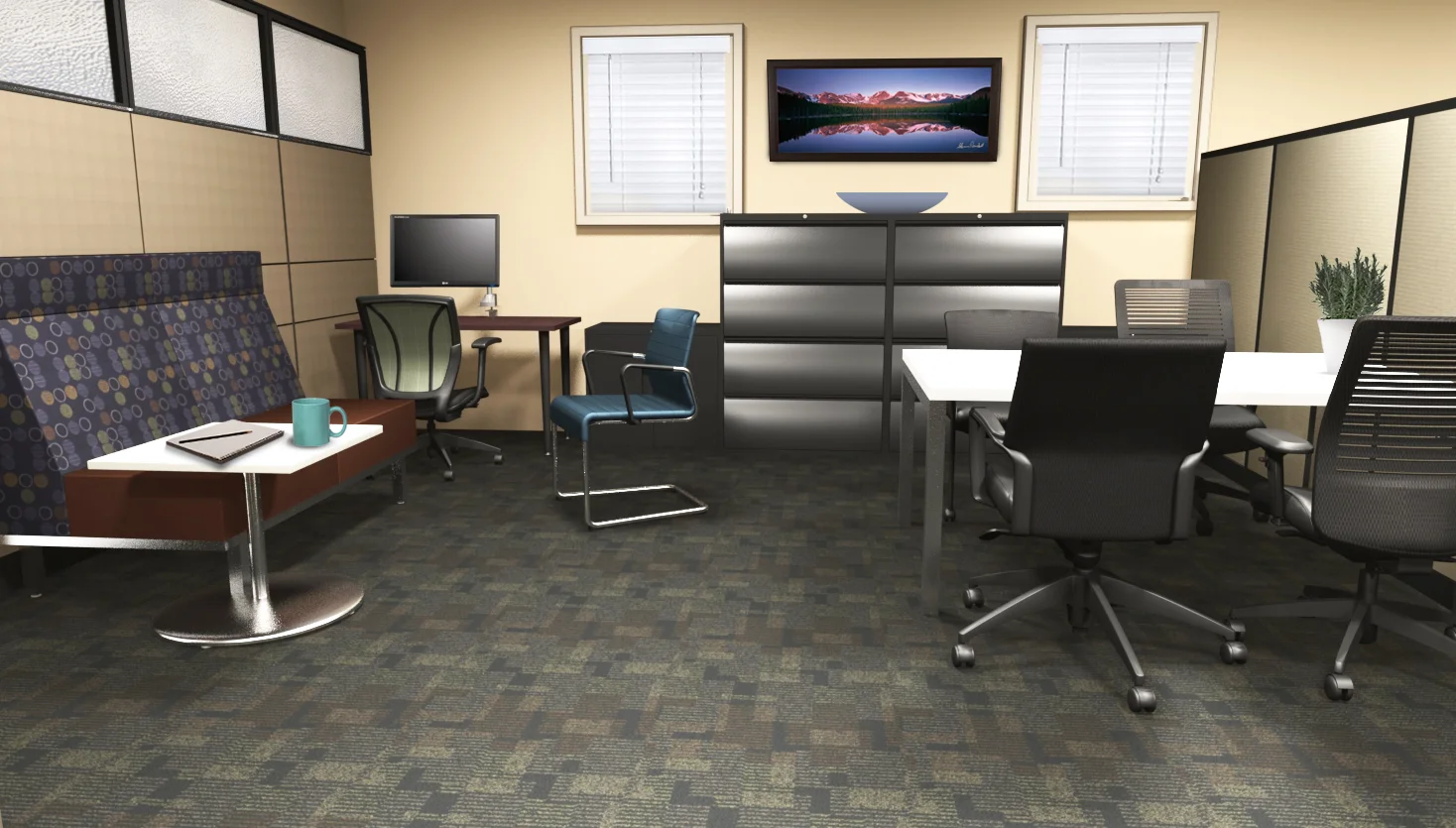 Our interior designers created multiple layout options to review what furniture systems would fulfill our interior needs. They also presented selected fabrics and finishes to coordinate the new furniture with the existing office aesthetic. The specified furniture and finishes were placed into Visual Impressions, a 3D computer rendering program, to visualize the office layout with the added furniture and finish selections.
